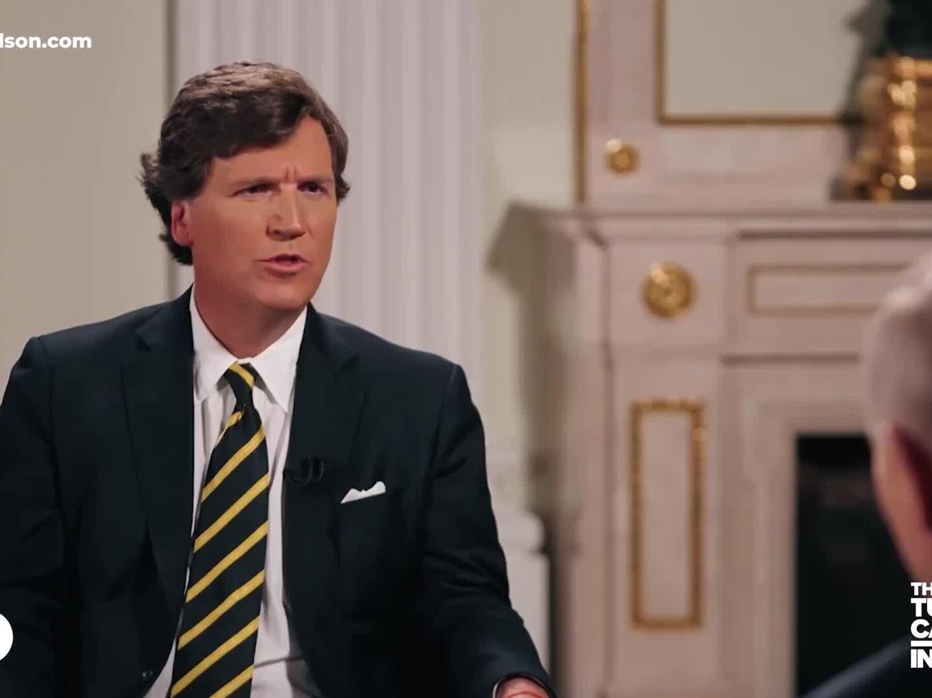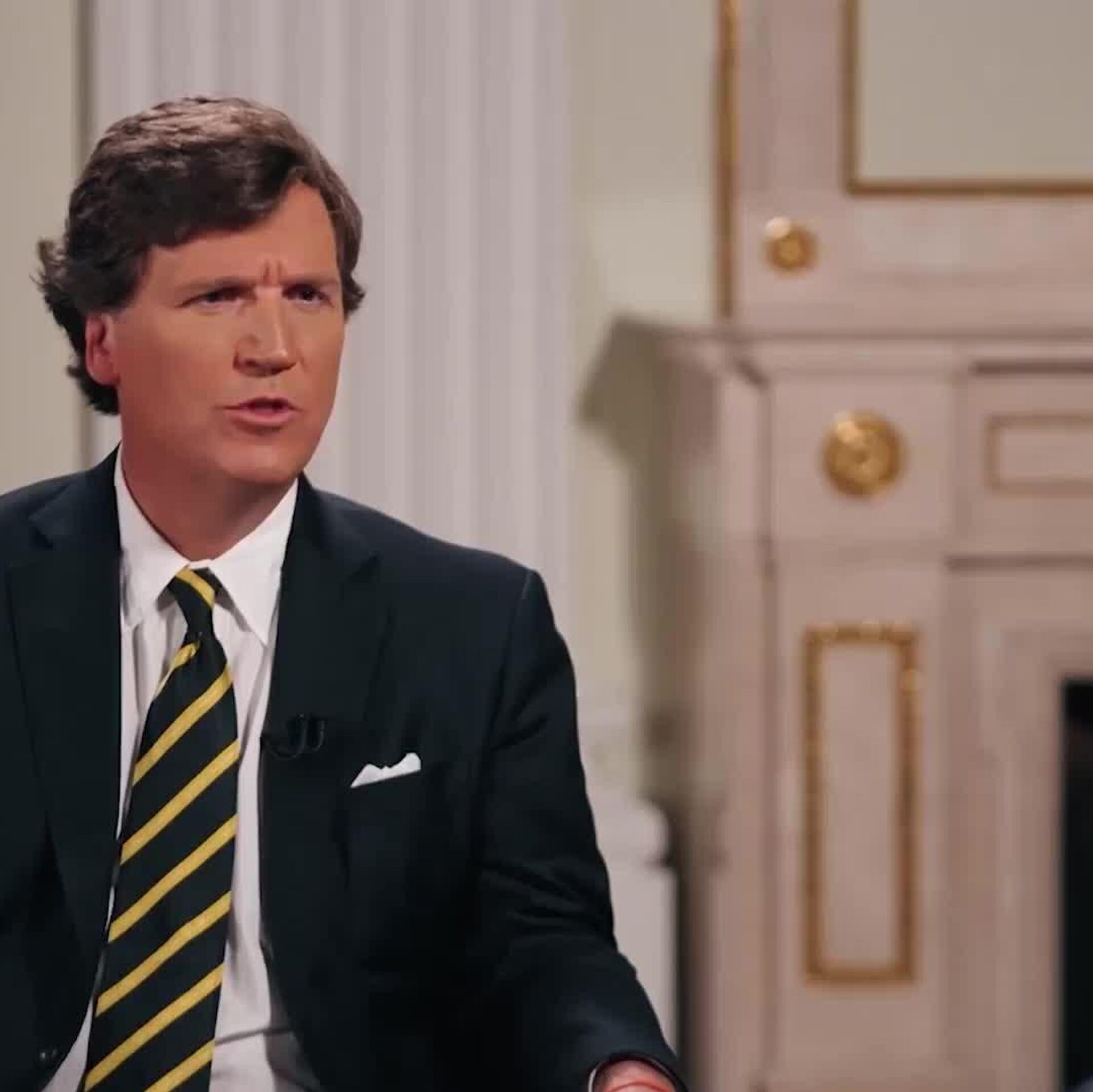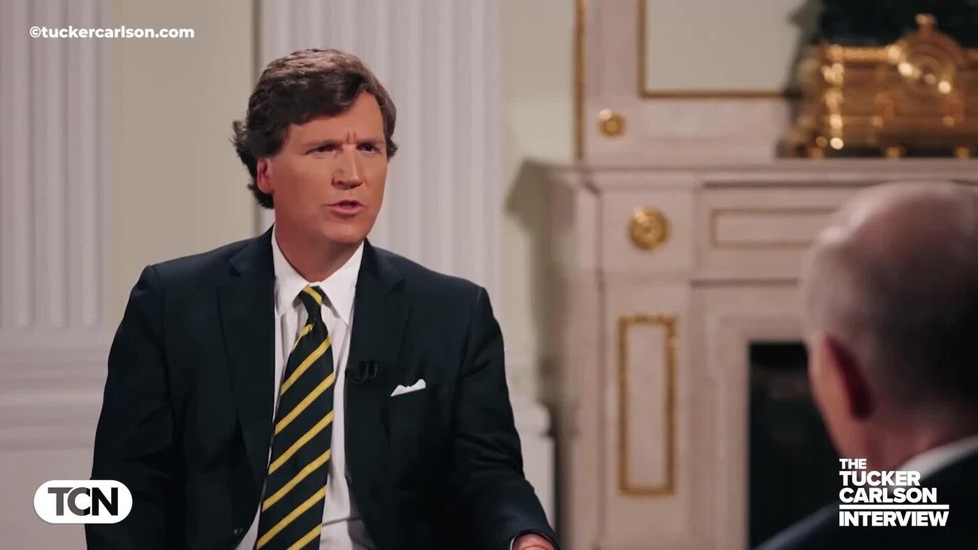 The video shows Vladimir Putin answering US journalist Tucker Carlson's question "Who blew up Nord Stream"?