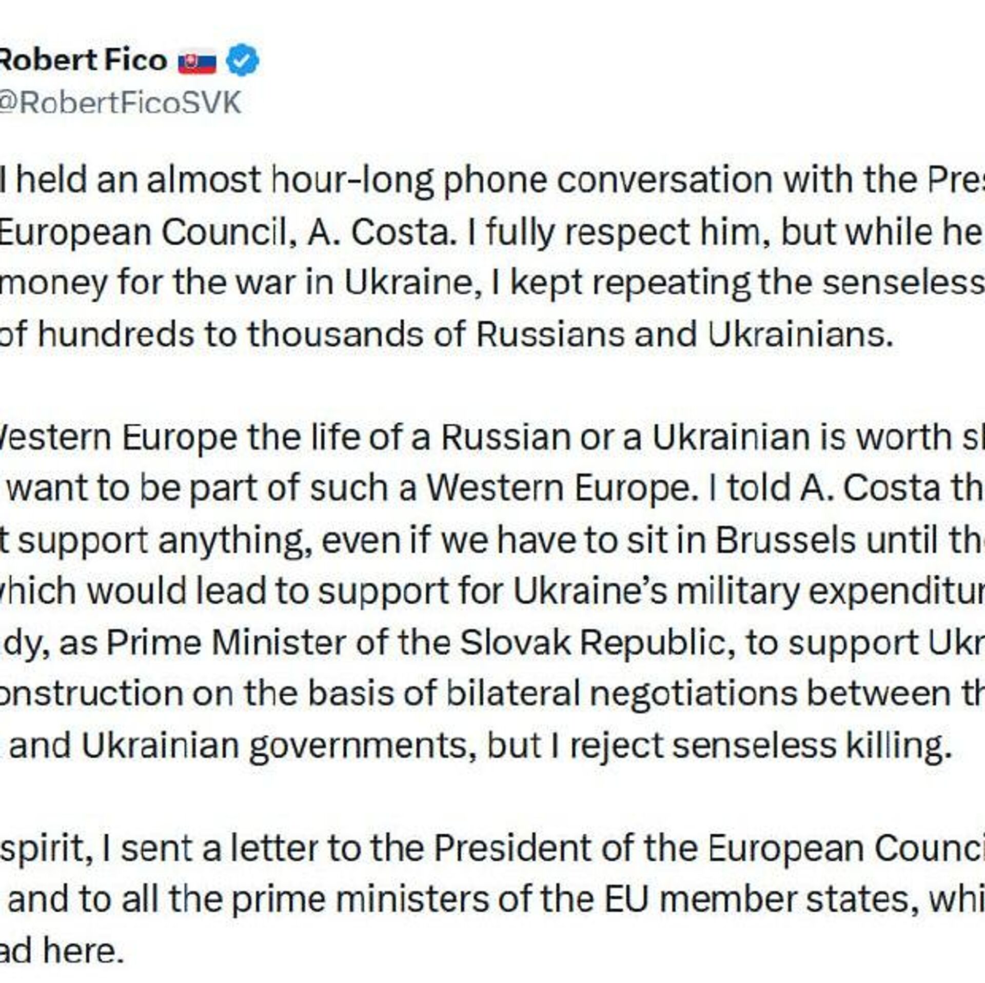 He referenced his recent letter to Costa, in which Fico made it clear that at an upcoming European Council session, he is “not be in position” to support any solution on Ukraine’s financial needs that could include covering the country’s military expenses.