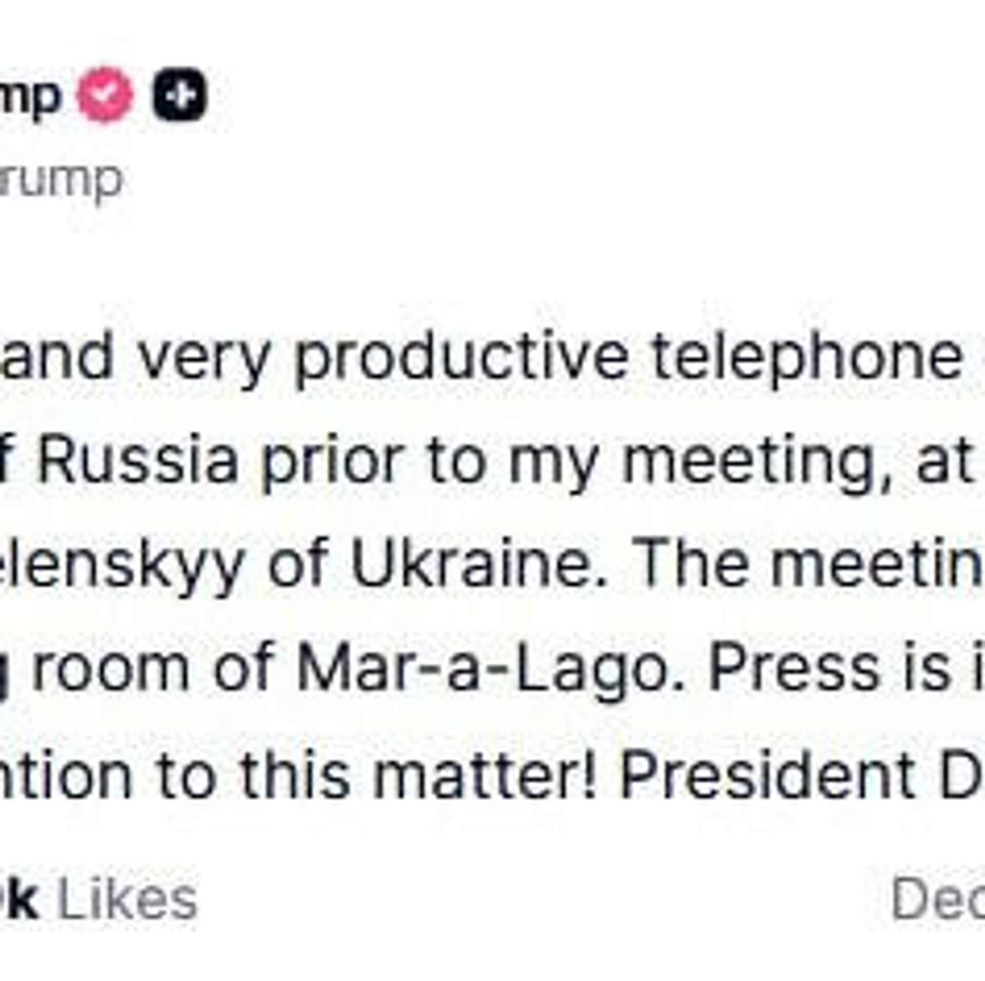 Trump says he had a very good and productive telephone call with Putin, prior to meeting with Zelensky in Miami.