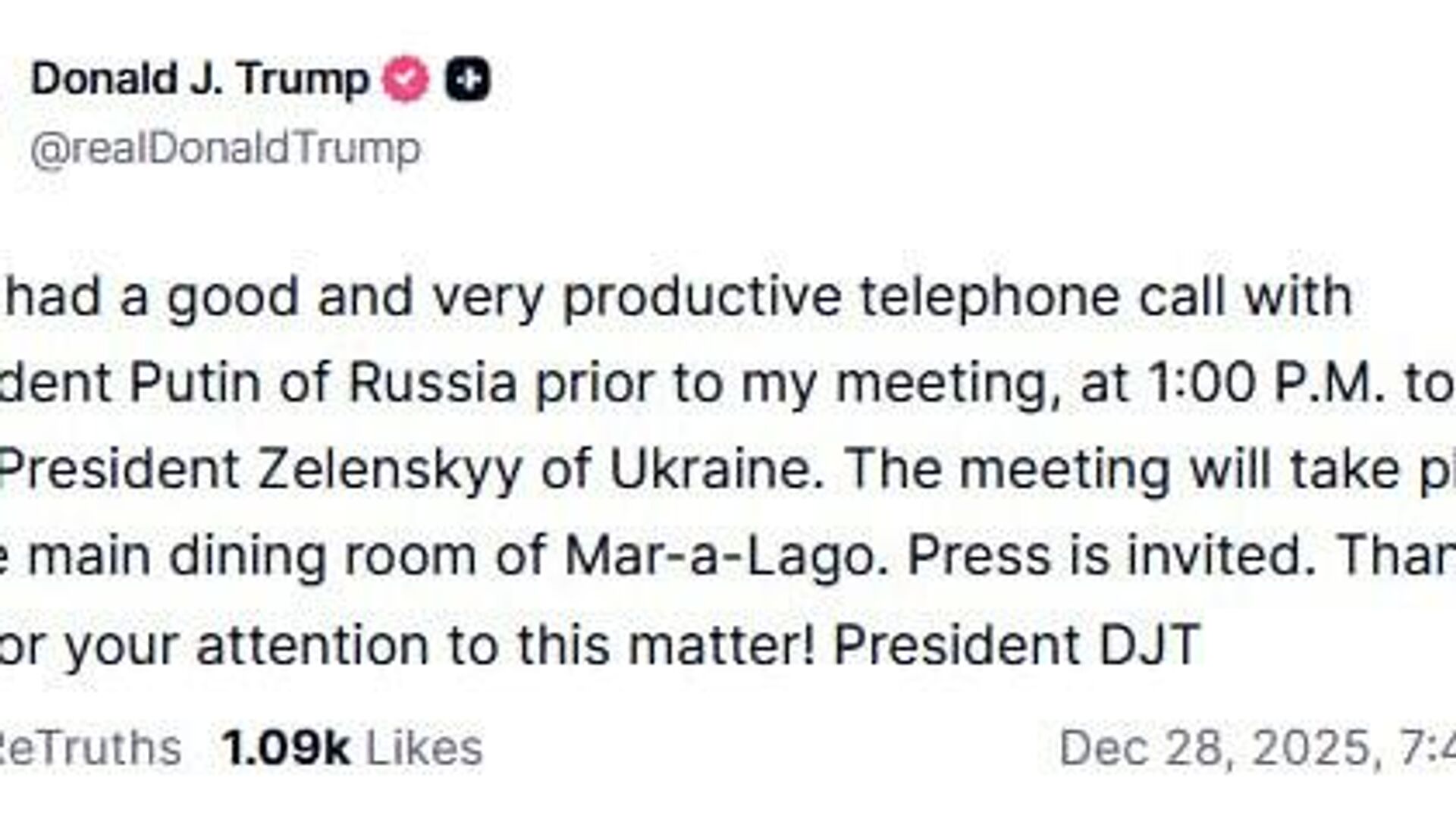 18:18 28.12.2025 (Updated: 18:24 28.12.2025) Trump says he had a very good and productive telephone call with Putin, prior to meeting with Zelensky in Miami.
