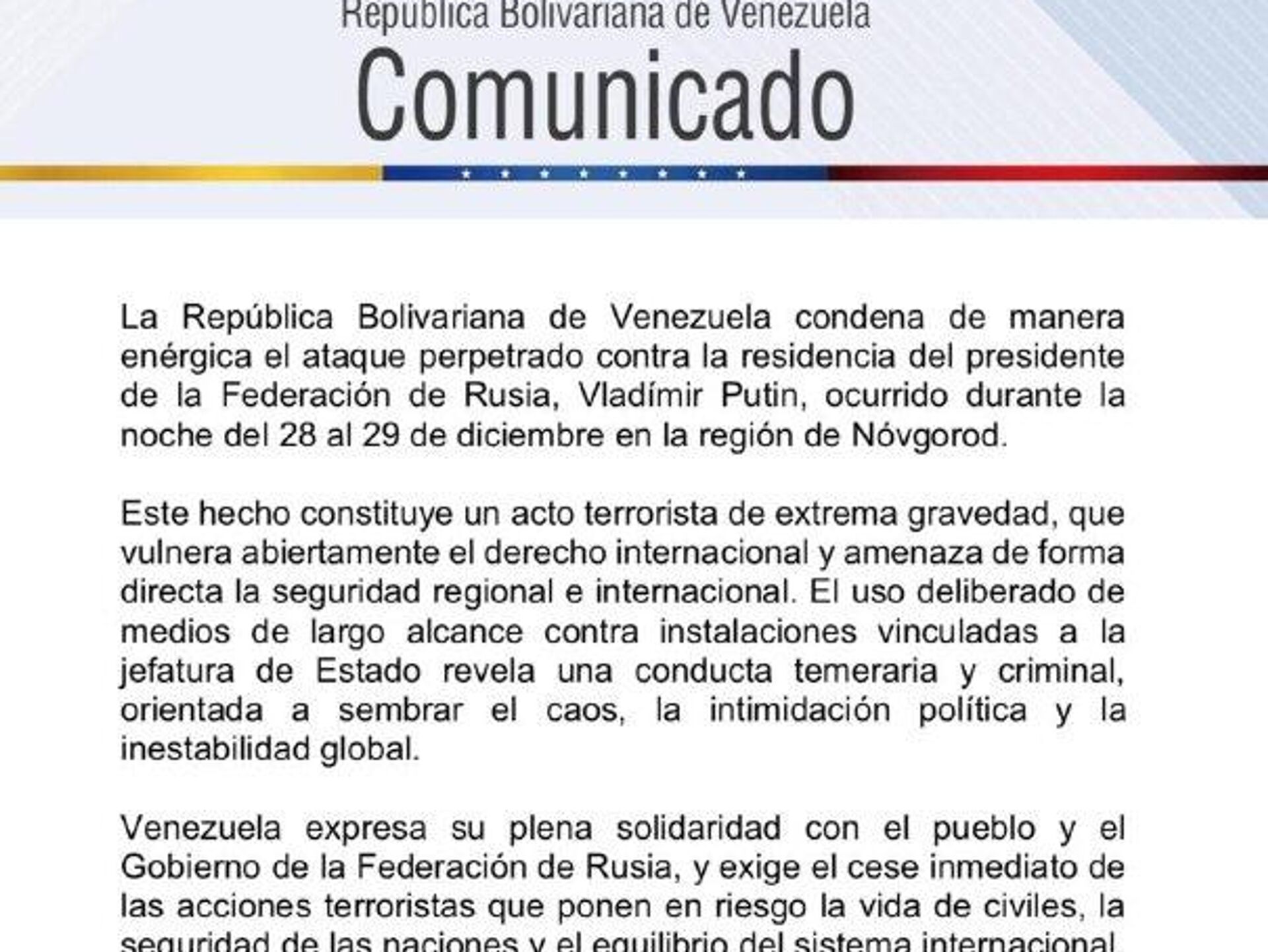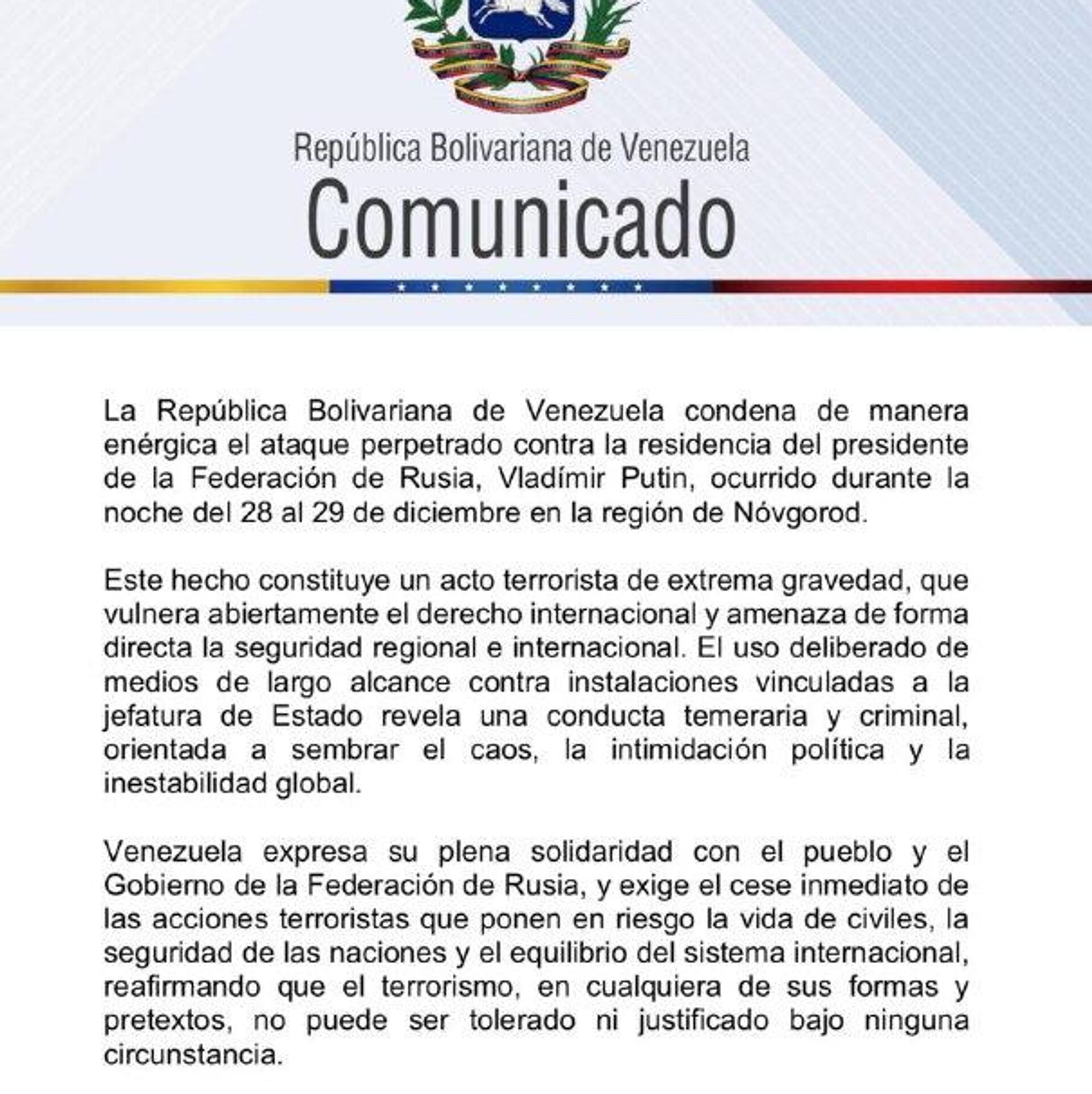 Venezuela also expressed full solidarity with the Russian people and government, demands an immediate halt to terrorist actions endangering civilians and international stability, and reaffirms that terrorism in any form or under any pretext is never acceptable or justifiable.