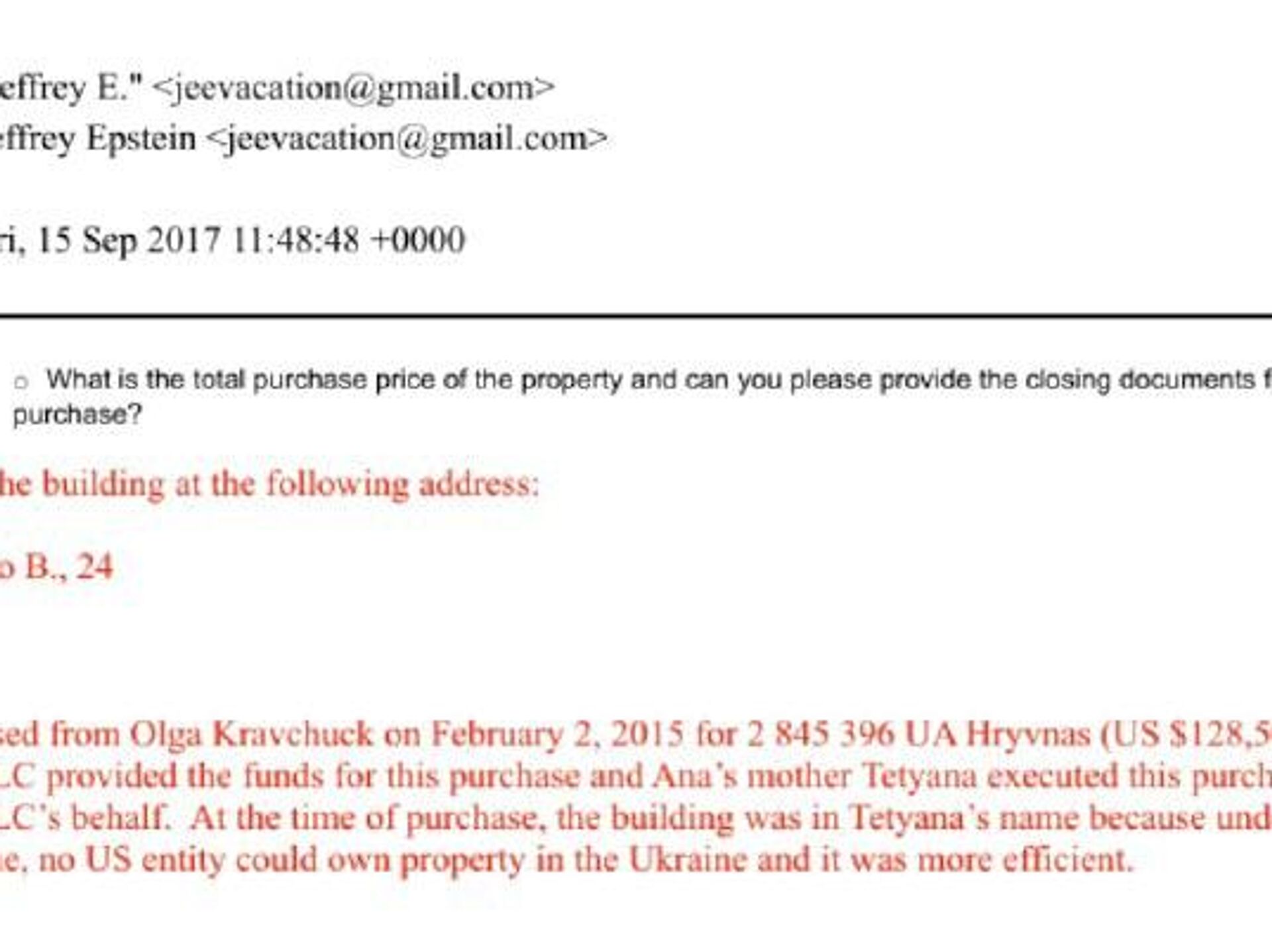 Emails from 2017 discuss the purchase of a mansion in Lvov involving Epstein. The property was allegedly registered under a Ukrainian national’s name to bypass local ownership restrictions