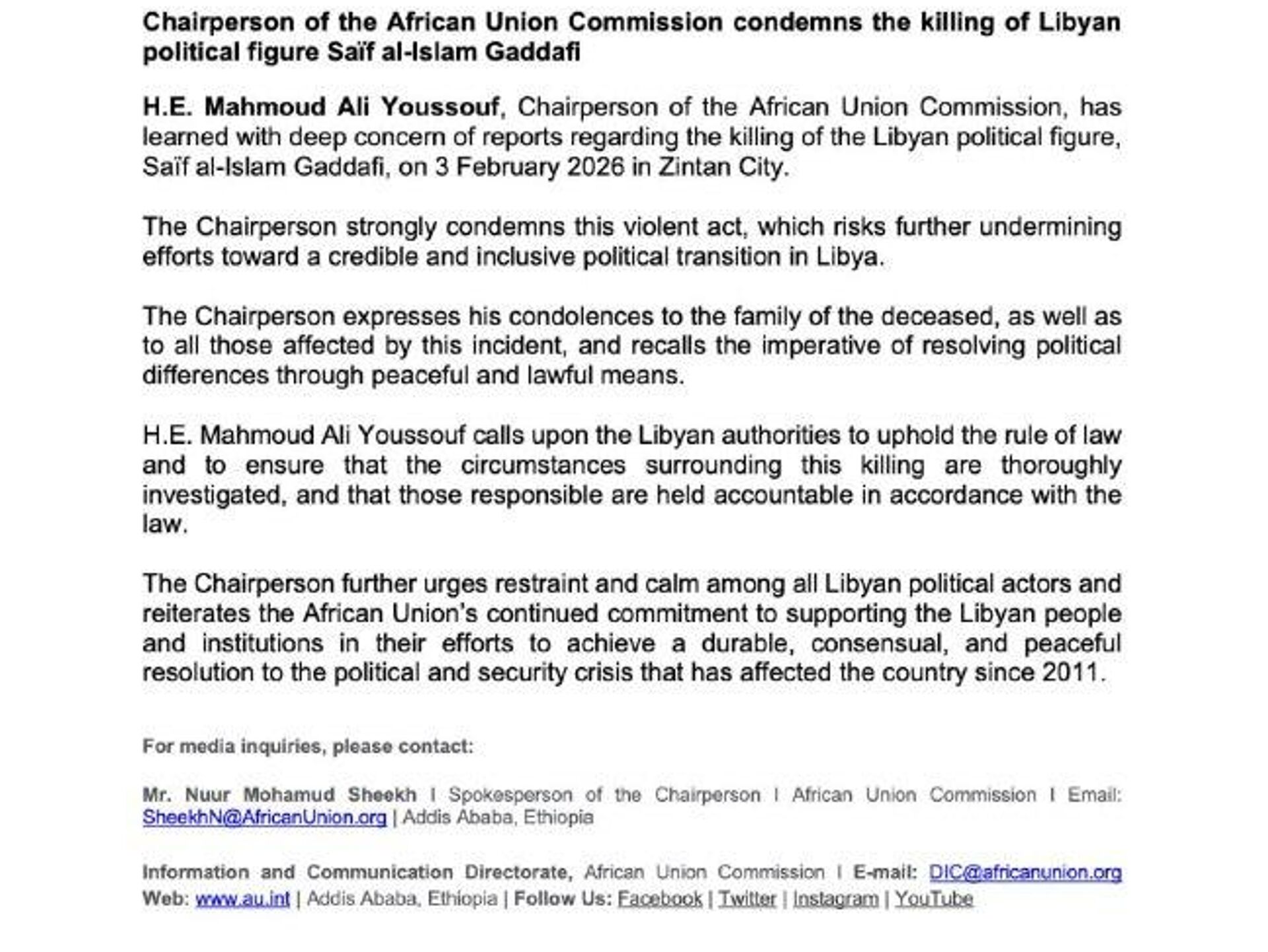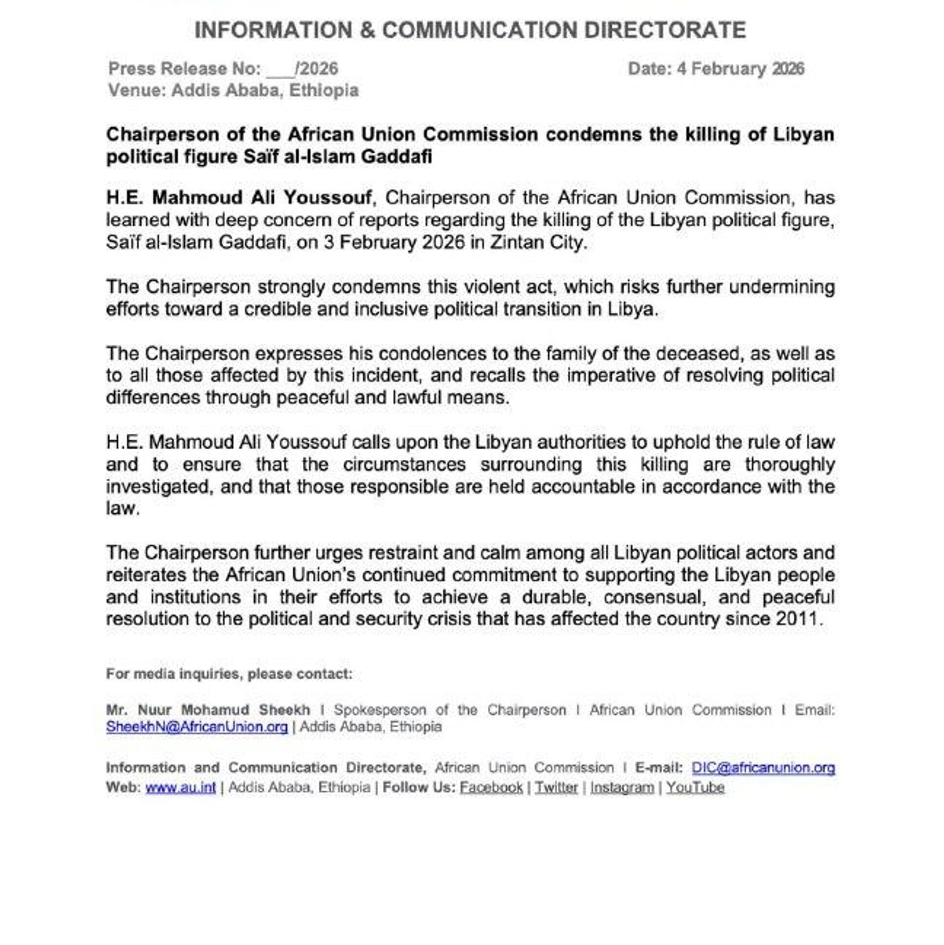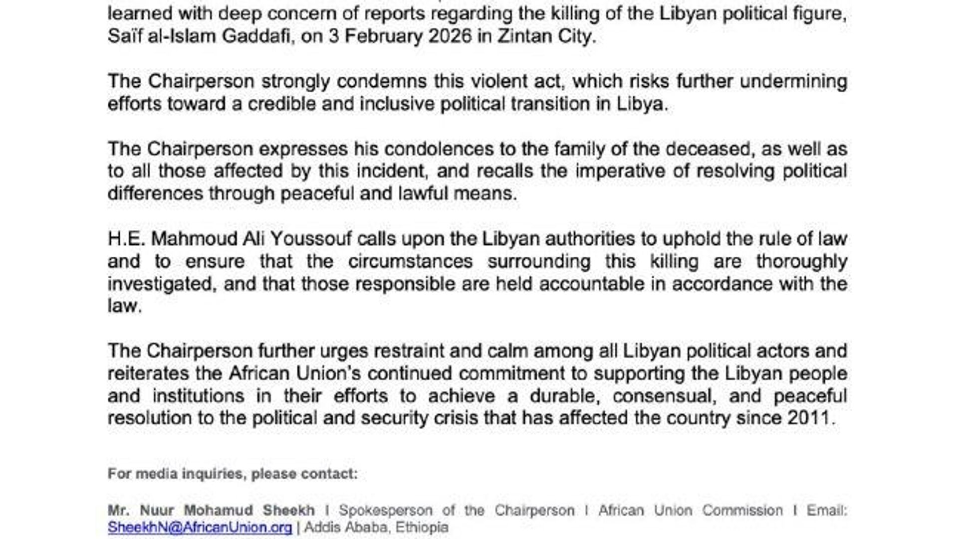 African Union Condemns Assassination of Gaddafi's Son This act of violence "risks further undermining efforts towards a credible and inclusive political transition in Libya," the organization said in a statement. The AU urged the Libyan authorities to "ensure that the circumstances surrounding this killing are thoroughly investigated, and and that those responsible are held accountable in accordance with the law."