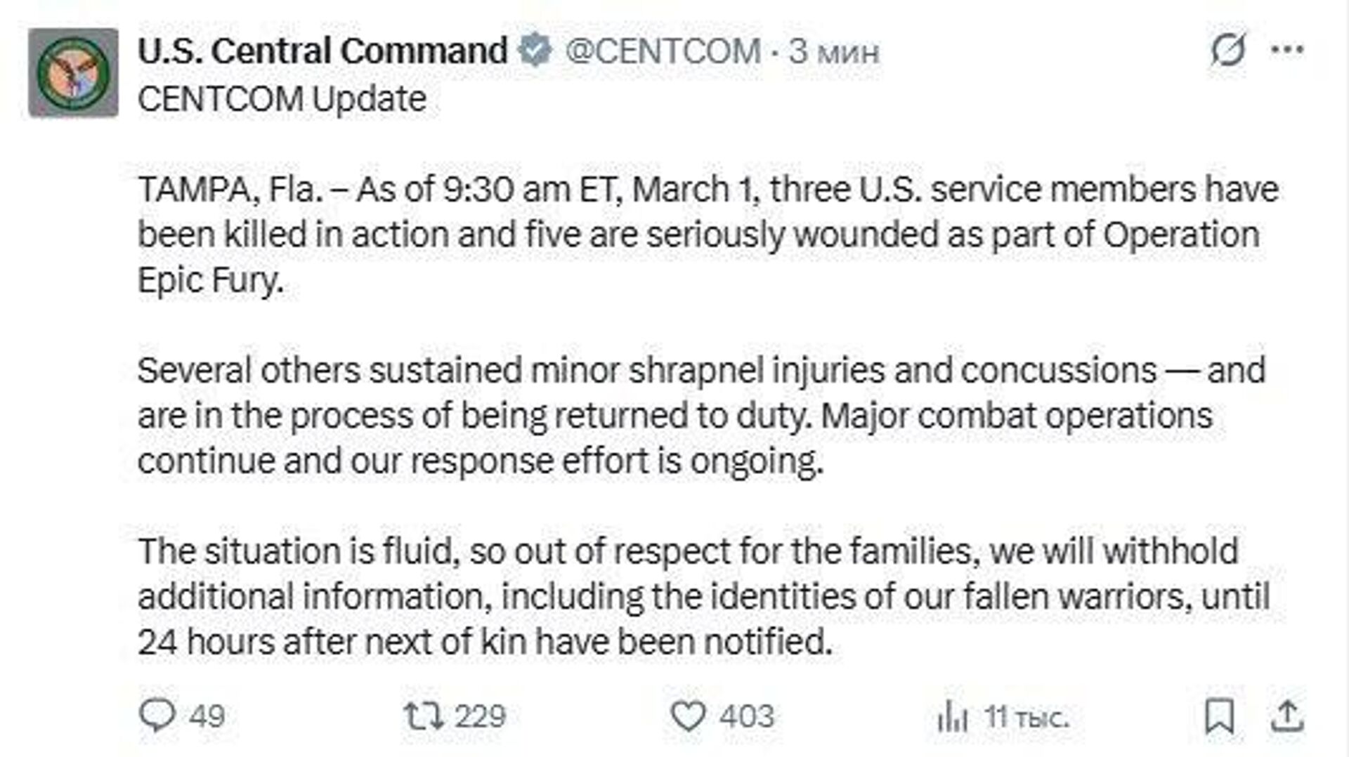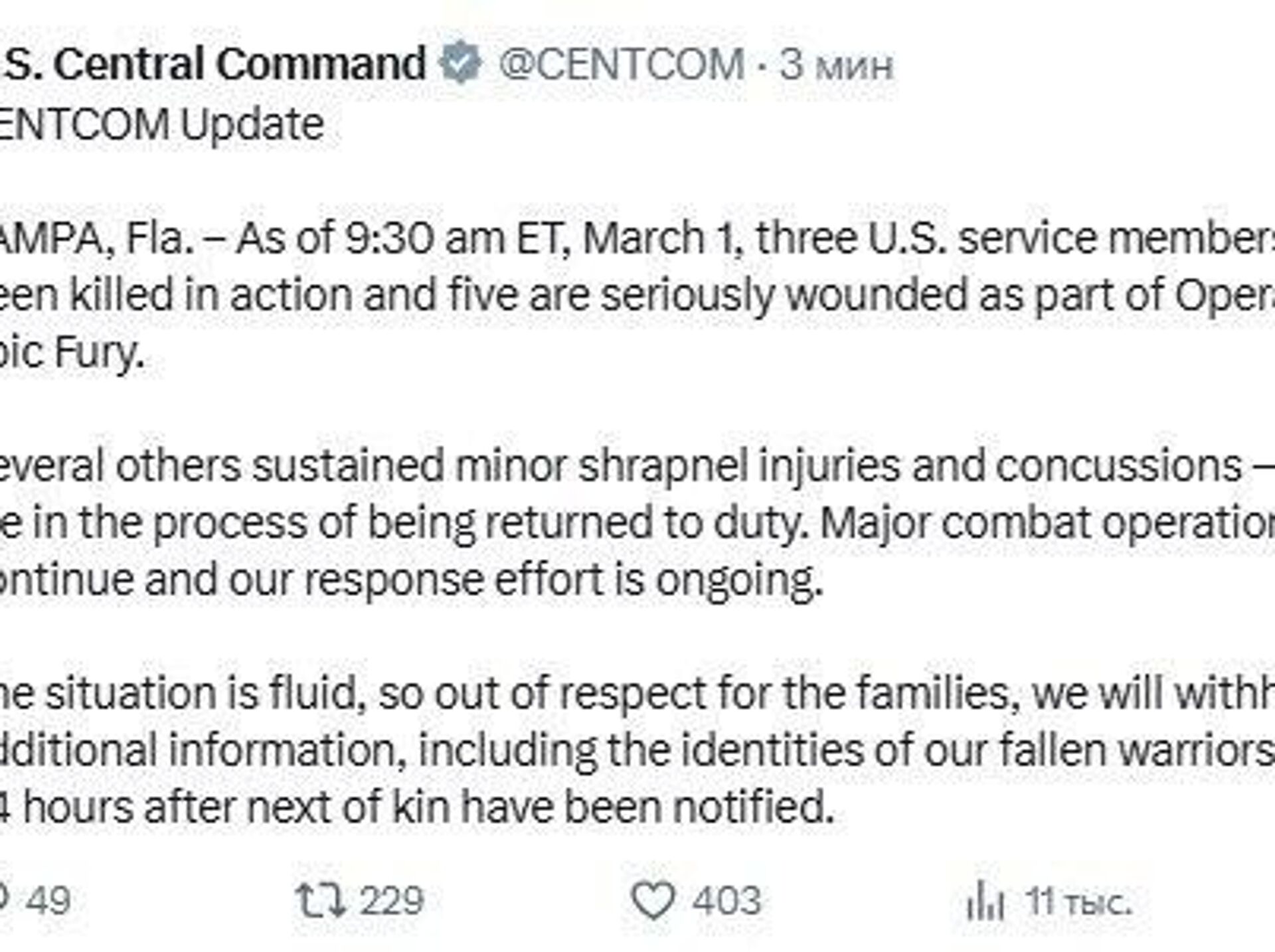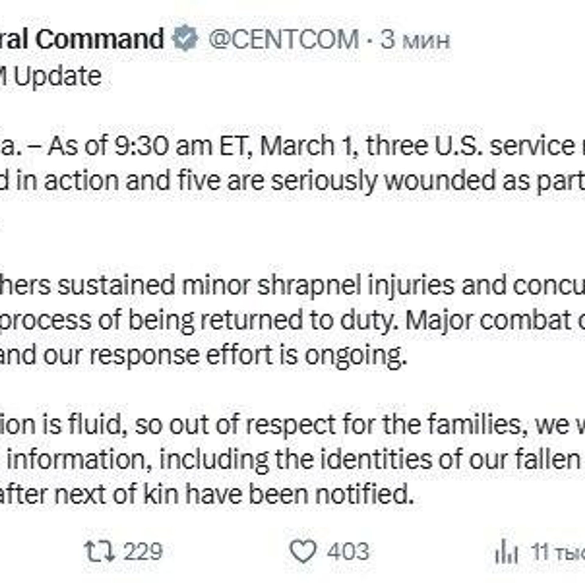 Three US Service Members Killed and Five Wounded in Operation Against Iran, US Military Says"Major combat operations continue and our response effort is ongoing," CENTCOM added.Subscribe to @sputnik_africa Sputnik Africa | X