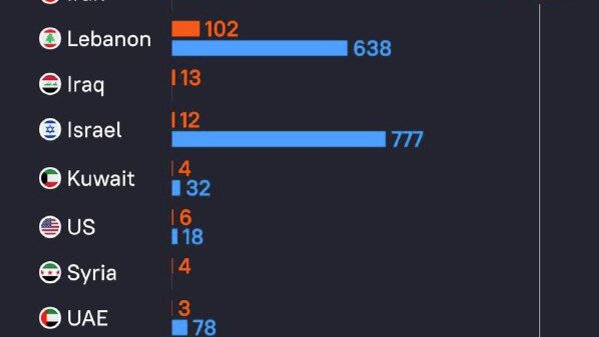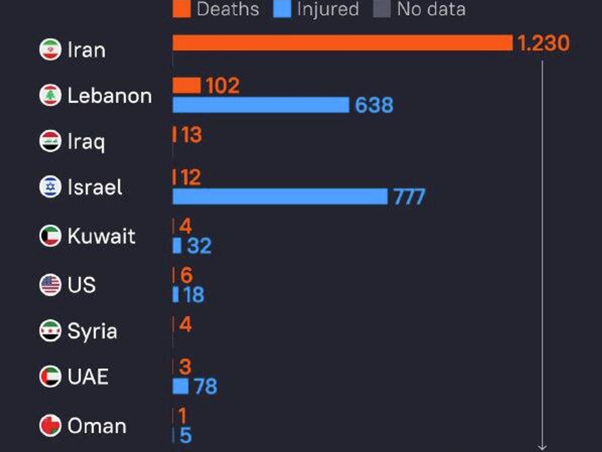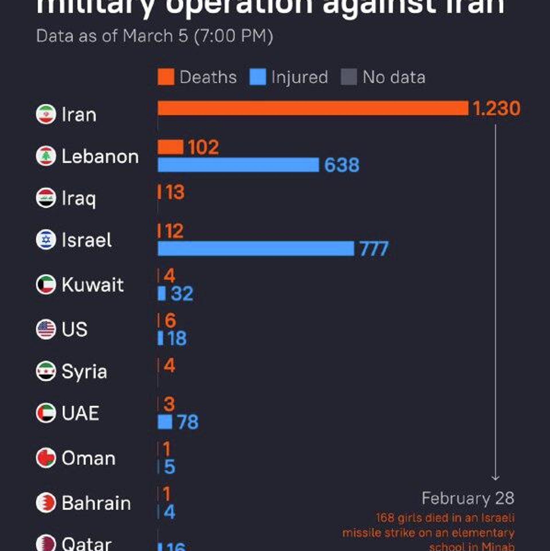 Iran reported over 1,200 fatalities, including 168 girls killed in the February 28 strike on a school in Minab. Casualties have also been reported across several Middle Eastern countries amid the ongoing escalation.