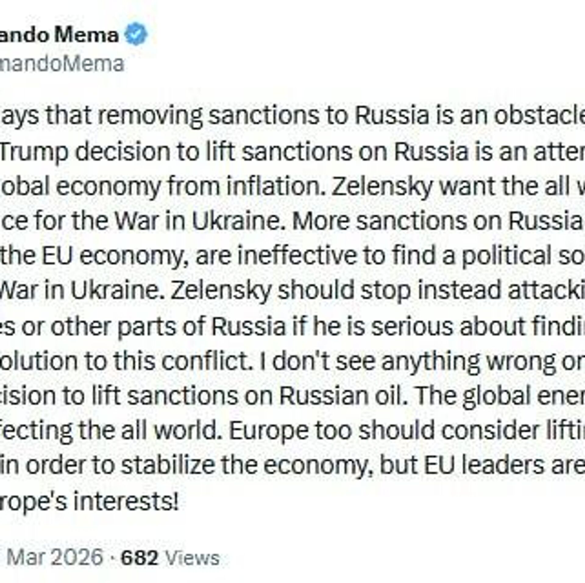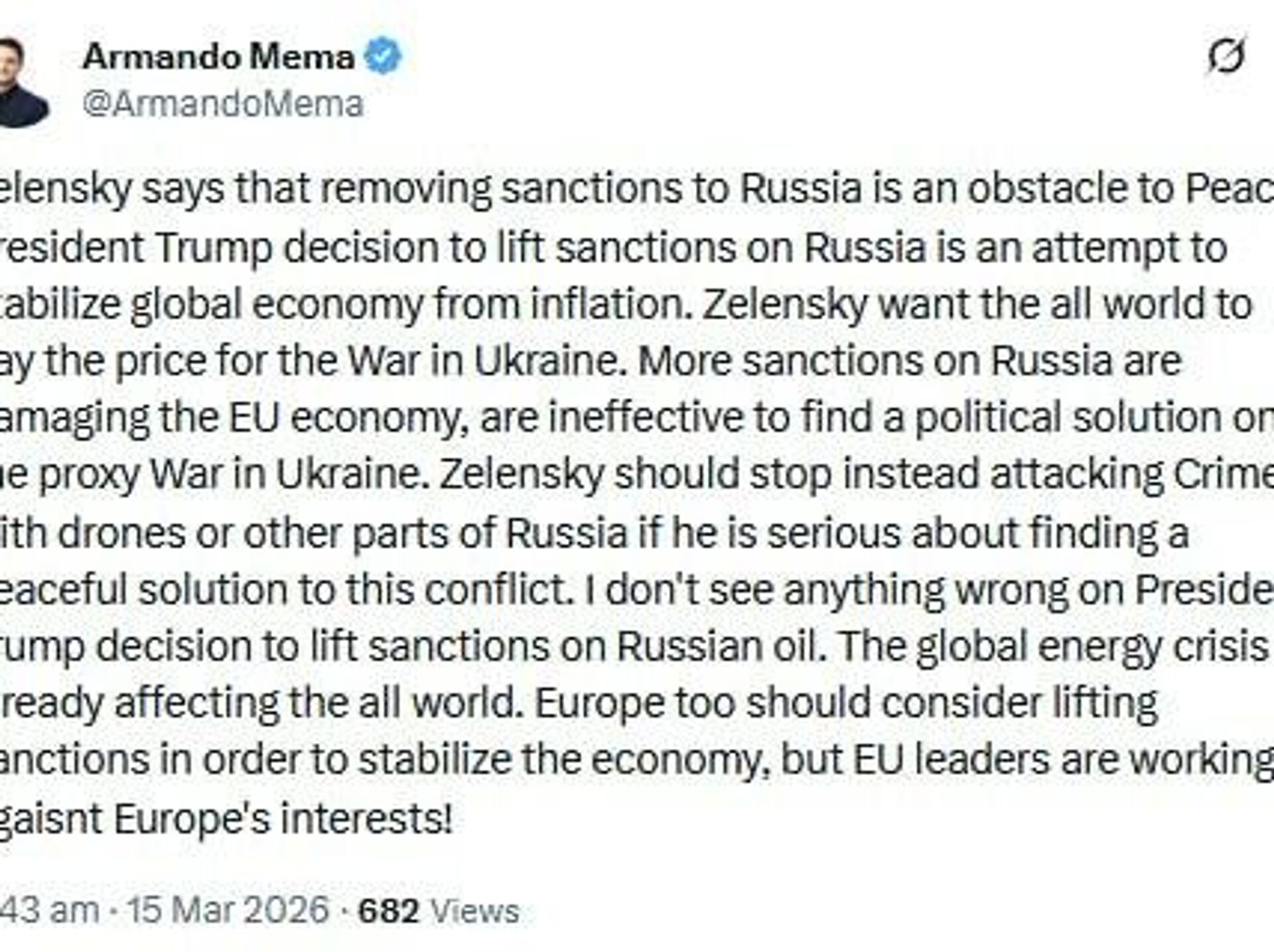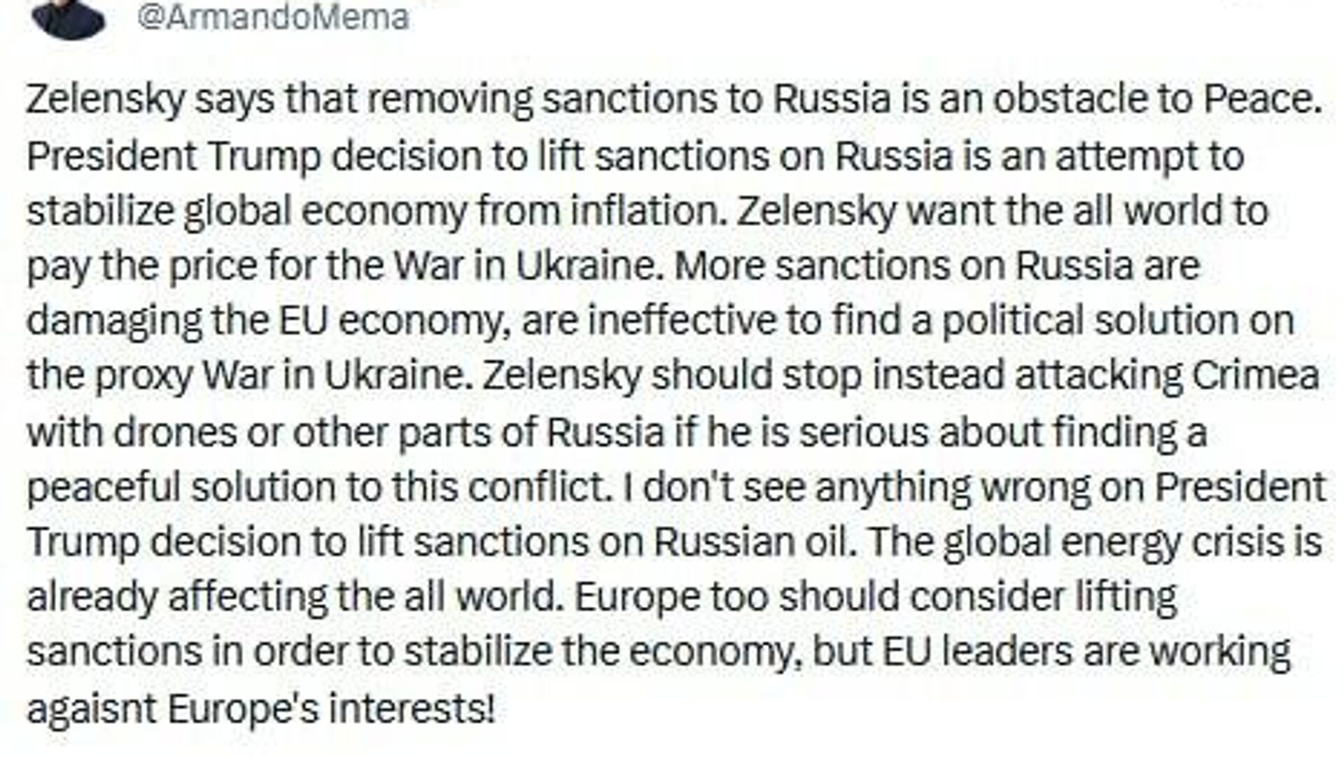 "More sanctions on Russia are damaging the EU economy and are ineffective in finding a political solution to the proxy war in Ukraine. Zelensky should stop attacking Crimea and other parts of Russia if he's serious about peace."