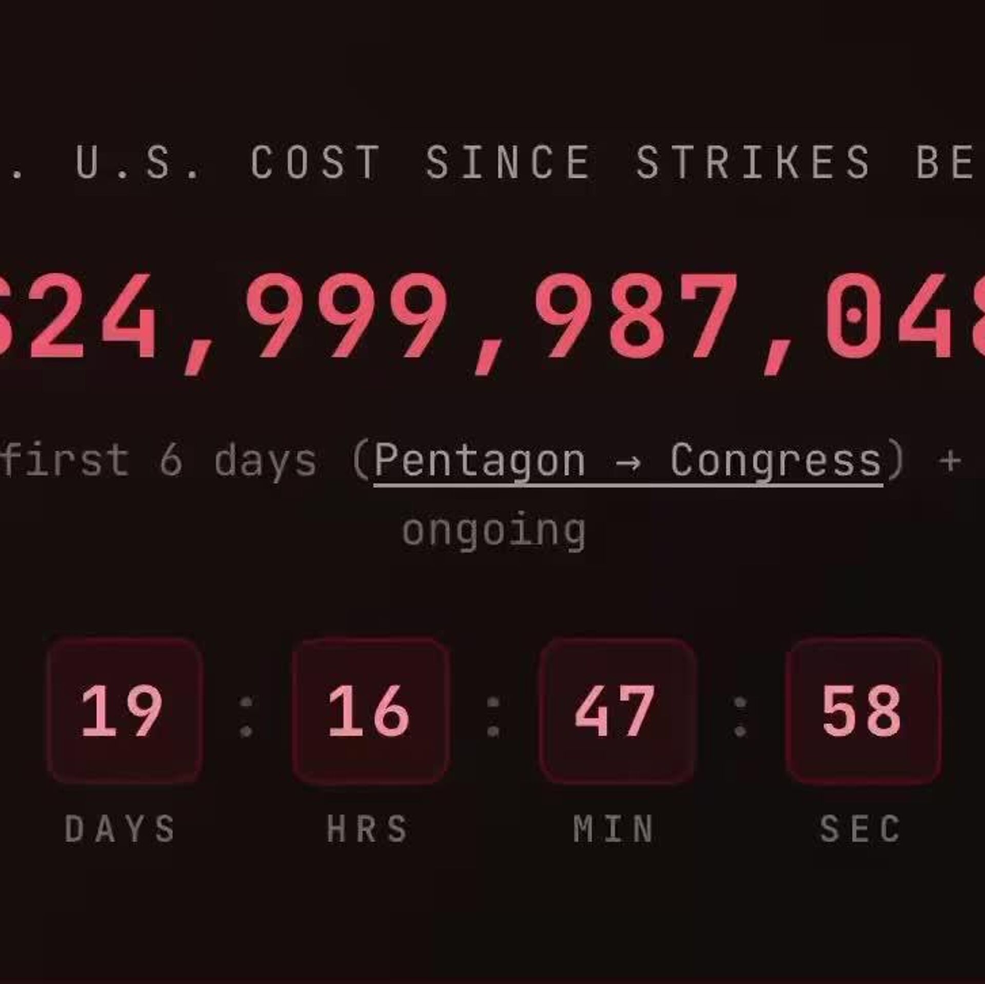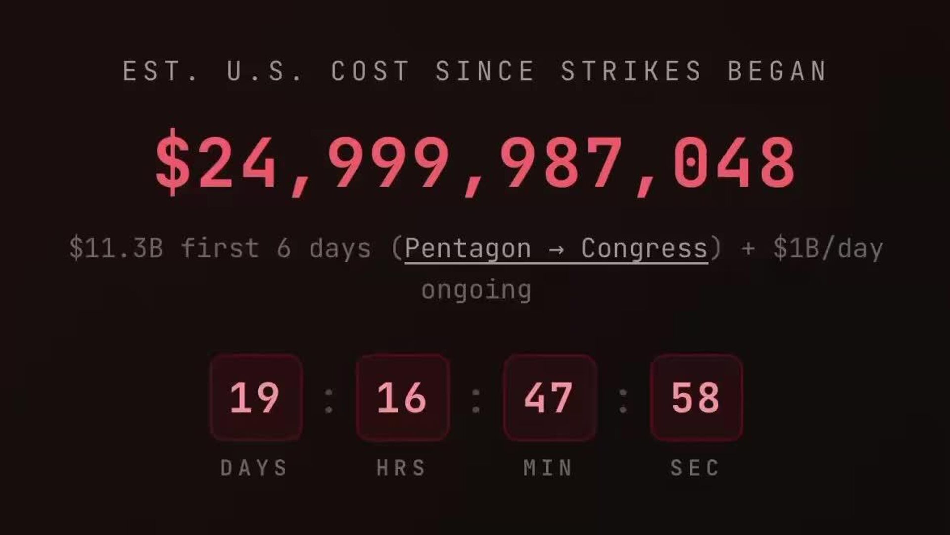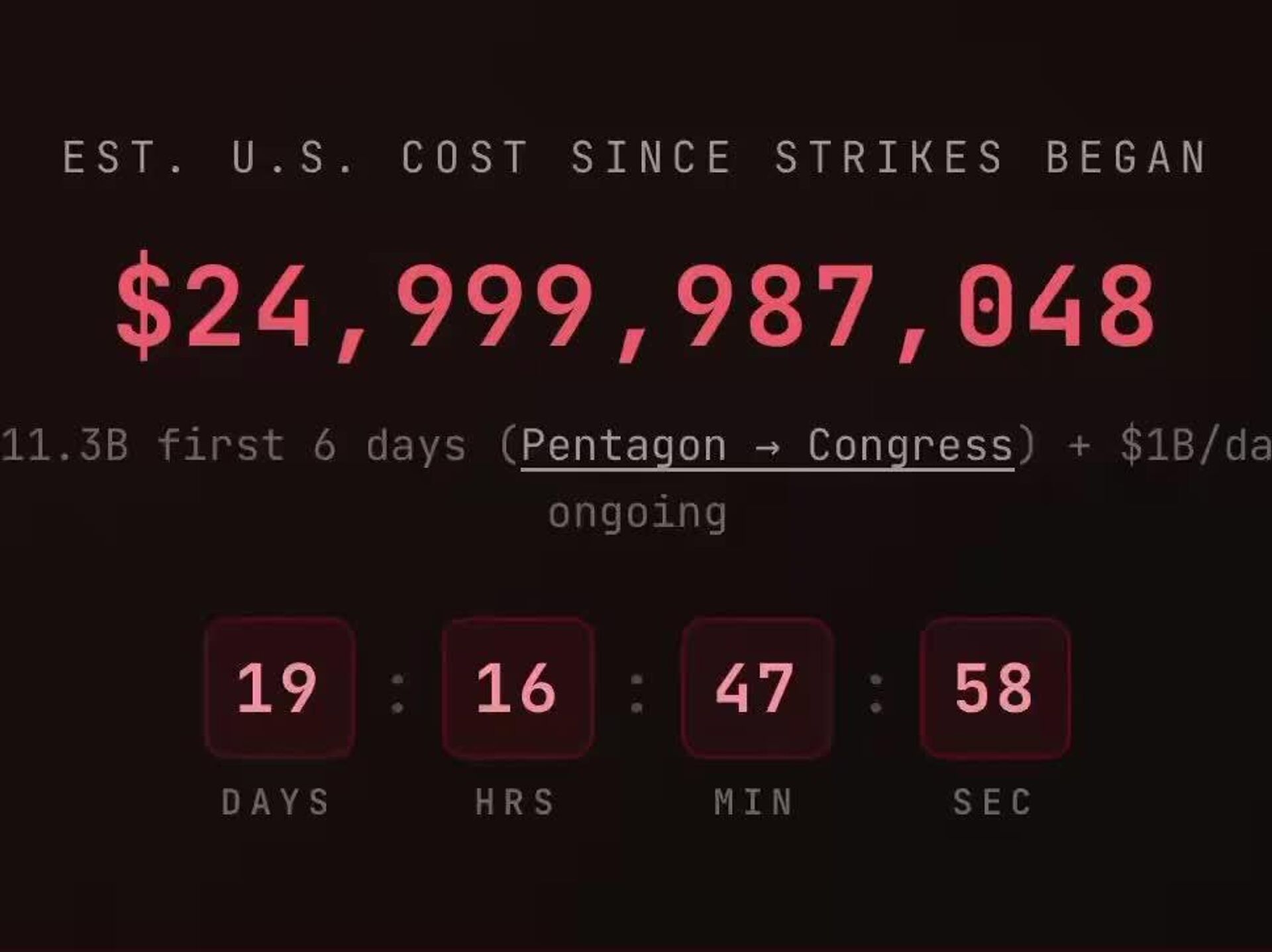 🟠 Tracker bases its estimate on a Pentagon briefing: $11.3 billion for the first six days, then about $1 billion a day—roughly $11,500 per second